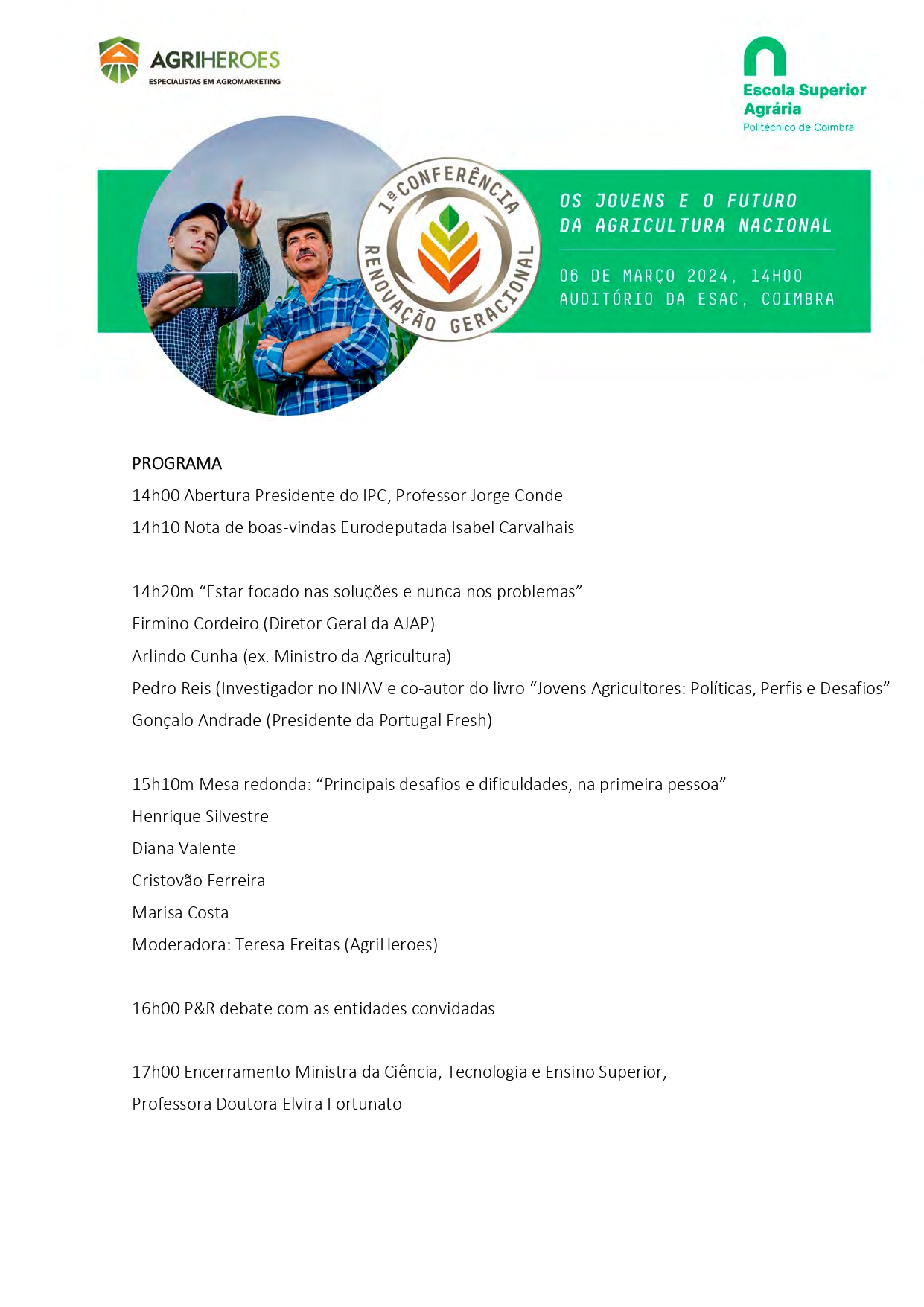 O evento é coorganizado pela ESAC e pela Agriheroes e pretende evidenciar a importância de se investir nos jovens agricultores e empresários rurais, peças-chave para a inovação, sustentabilidade e revitalização das suas comunidades. Com o foco voltado para a superação dos obstáculos que impedem o envolvimento ativo dos jovens, como a dificuldade de acesso a terras e a transferência de conhecimento intergeracional, o evento almeja fomentar políticas de suporte e oportunidades para esta nova geração no setor agrícola.