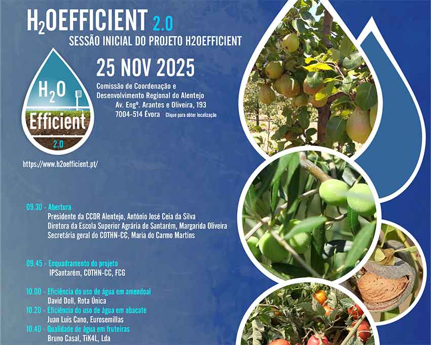 O projeto H2OEfficient, coordenado pela Escola Superior Agrária de Santarém (ESAS) e pelo Centro Operativo e Tecnológico Hortofrutícola Nacional ‒ Centro de Competências (COTHN‑CC), entra numa nova fase no período 2025‑2027, com um plano alargado e ambicioso. Esta nova edição reforça a missão do projeto: promover práticas agrícolas mais eficientes no uso da água, respondendo aos desafios crescentes da escassez hídrica, das alterações climáticas e da sustentabilidade do setor agrícola em Portugal.