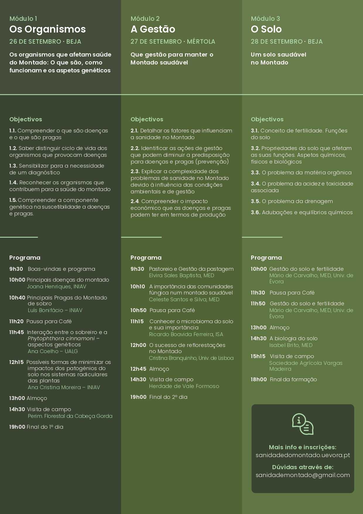 A formação é repartida por três módulos. No dia 26, começar-se-á por explorar os organismos que afetam a saúde do Montado. No segundo dia, 27, será dedicado à análise das práticas de gestão que fazem a diferença entre um Montado resiliente e um suscetível a doenças e pragas. No dia 28, finaliza-se pela base de todo o sistema, ou seja, como promover um solo saudável no Montado. Durante as várias sessões, os participantes terão a oportunidade de partilhar experiências, participar ativamente nas sessões teóricas e práticas e conviver.