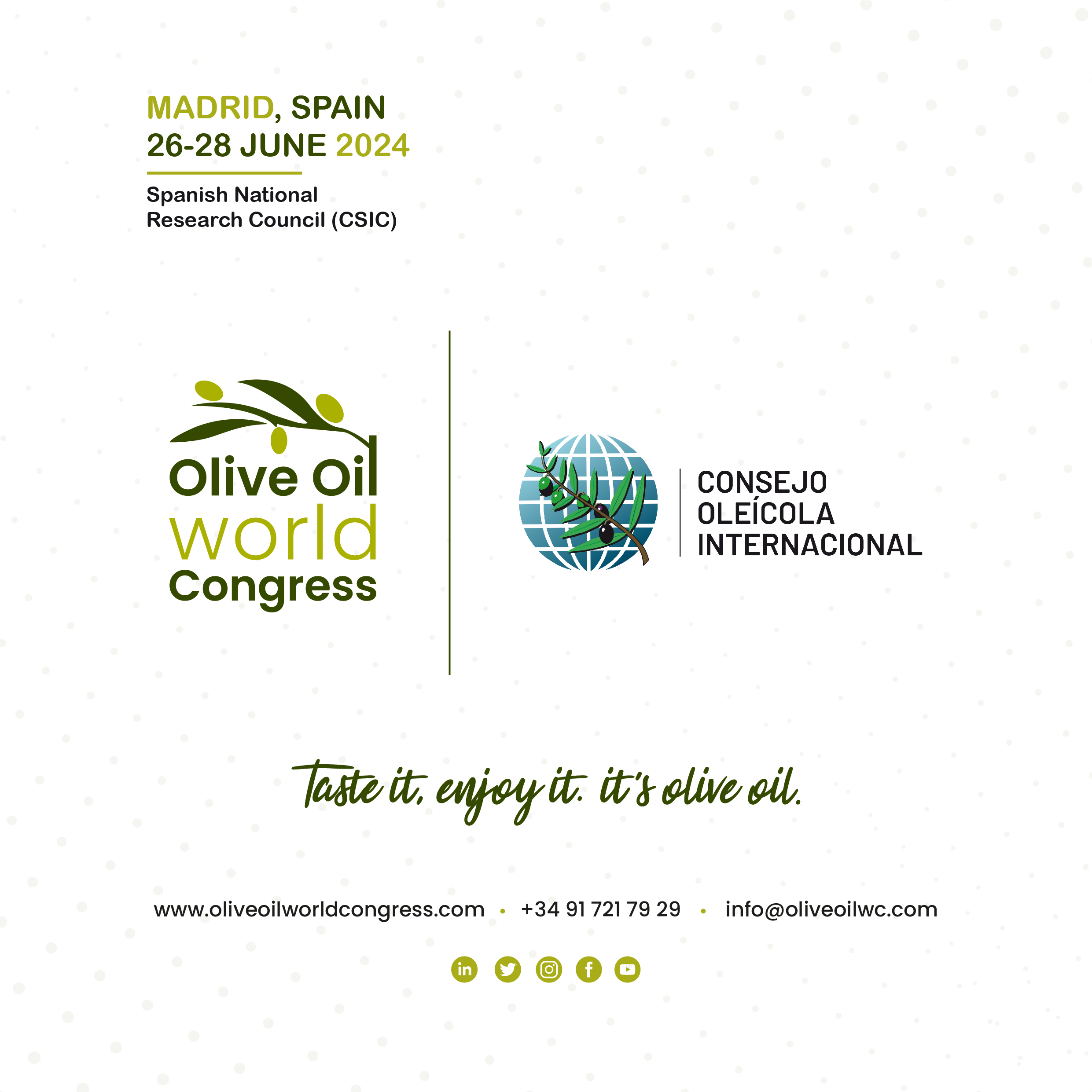 O Olive Oil World Congress (OOWC) continua a reforçar o seu carácter internacional, acrescentando um novo apoio à sua celebração de 26 a 28 de junho de 2024 em Madrid, com a incorporação do Conselho Oleícola Internacional (COI) no Comité Organizador, a única entidade intergovernamental internacional dedicada ao azeite e às azeitonas de mesa.
