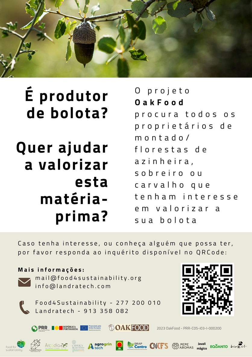 O projeto OakFood - Valorização integrada da bolota como matéria-prima portuguesa para produtos alimentares diferenciadores - pretende o desenvolvimento de uma estratégia integrada para a viabilidade da bolota como matéria-prima para o desenvolvimento de produtos de valor acrescentado, enquanto alternativa sustentável e de cadeia curta, para a indústria alimentar. No âmbito deste projeto está prevista a criação de uma rede de produtores de bolota em Portugal Continental, estando a ser desenvolvido um mapeamento de todos os potenciais produtores nacionais com áreas de quercíneas (montados e/ou carvalhais).