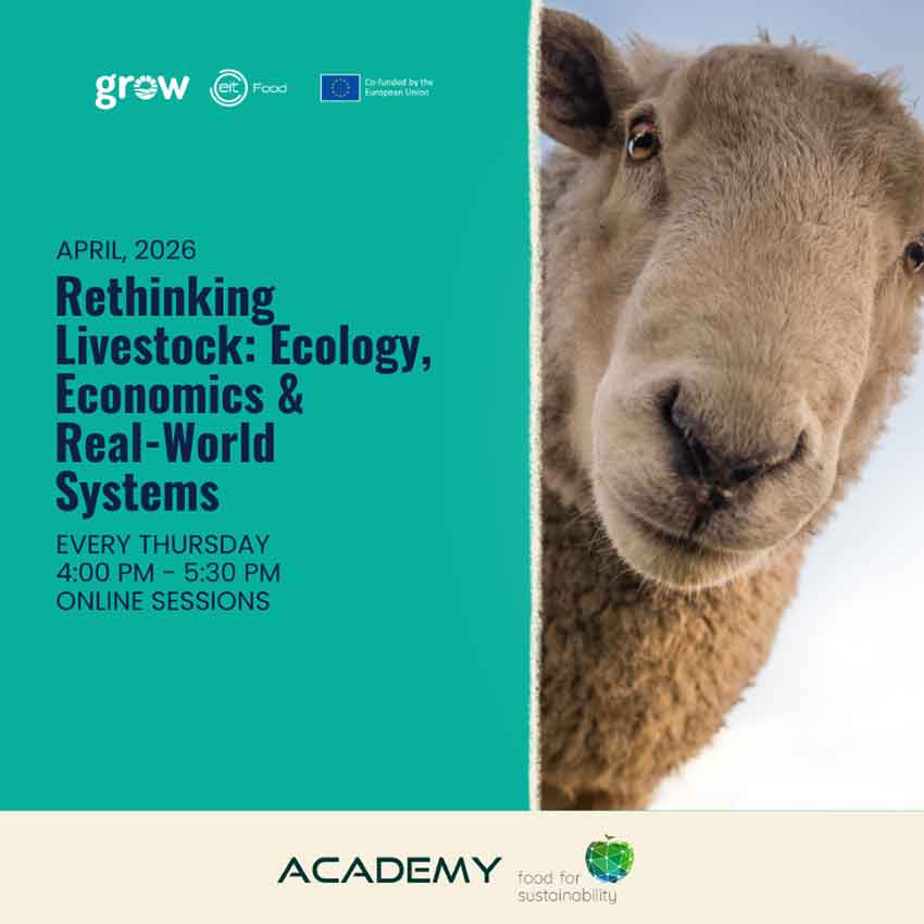 O Food4Sustainability Academy, no âmbito do programa Grow, lança um novo ciclo de webinars “Rethinking Livestock: Ecology, Economics & Real-World Systems”, que decorrerá a partir de 16 de abril, todas as quintas-feiras, das 16h00 às 17h30 (hora de Portugal).