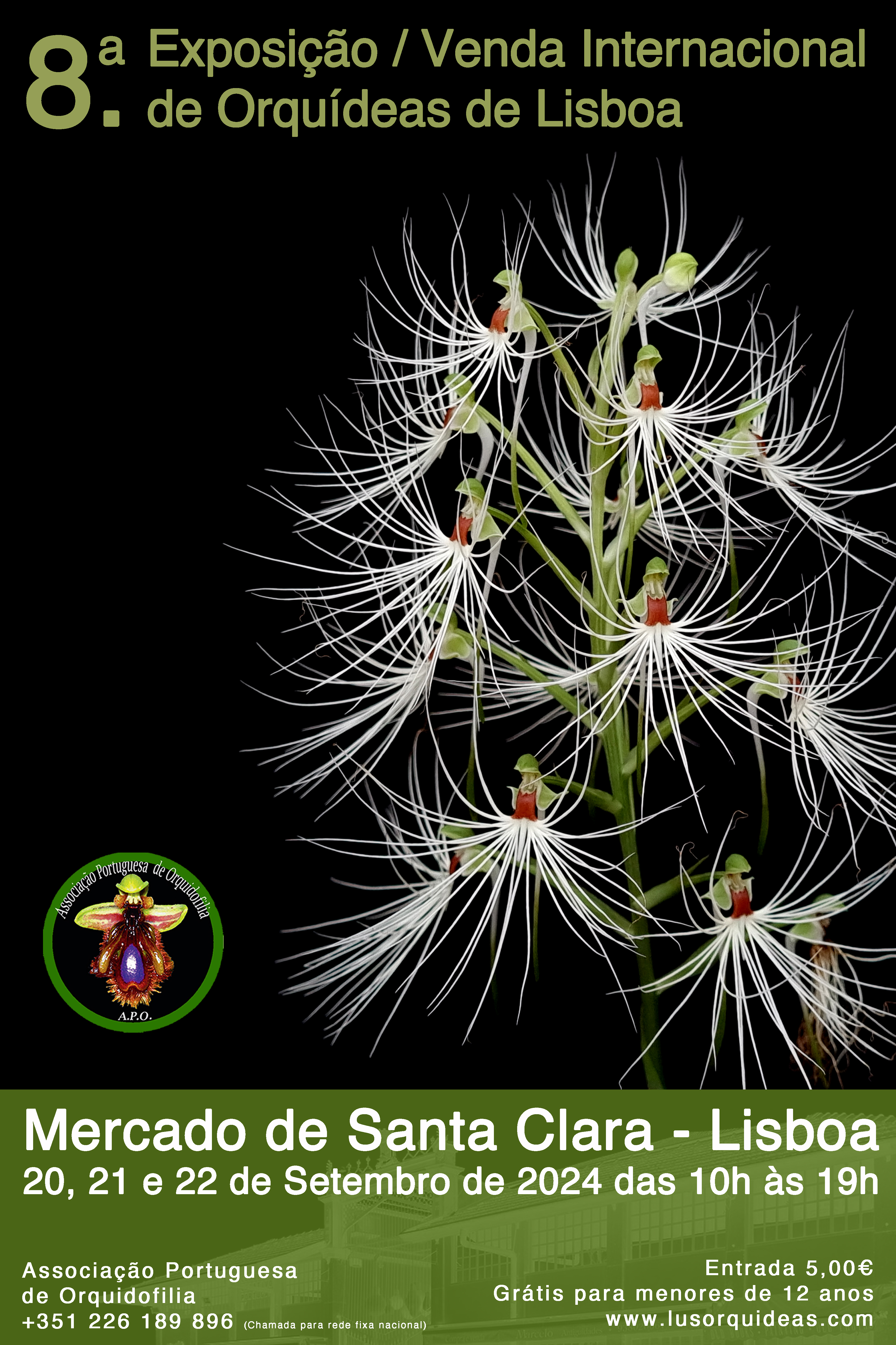 A Associação Portuguesa de Orquidofilia (A.P.O.) tem o orgulho de anunciar a realização da 8.ª Exposição / Venda Internacional de Orquídeas de Lisboa nos dias 20, 21 e 22 de setembro de 2024, no Mercado de Santa Clara (Feira da Ladra), em Lisboa.