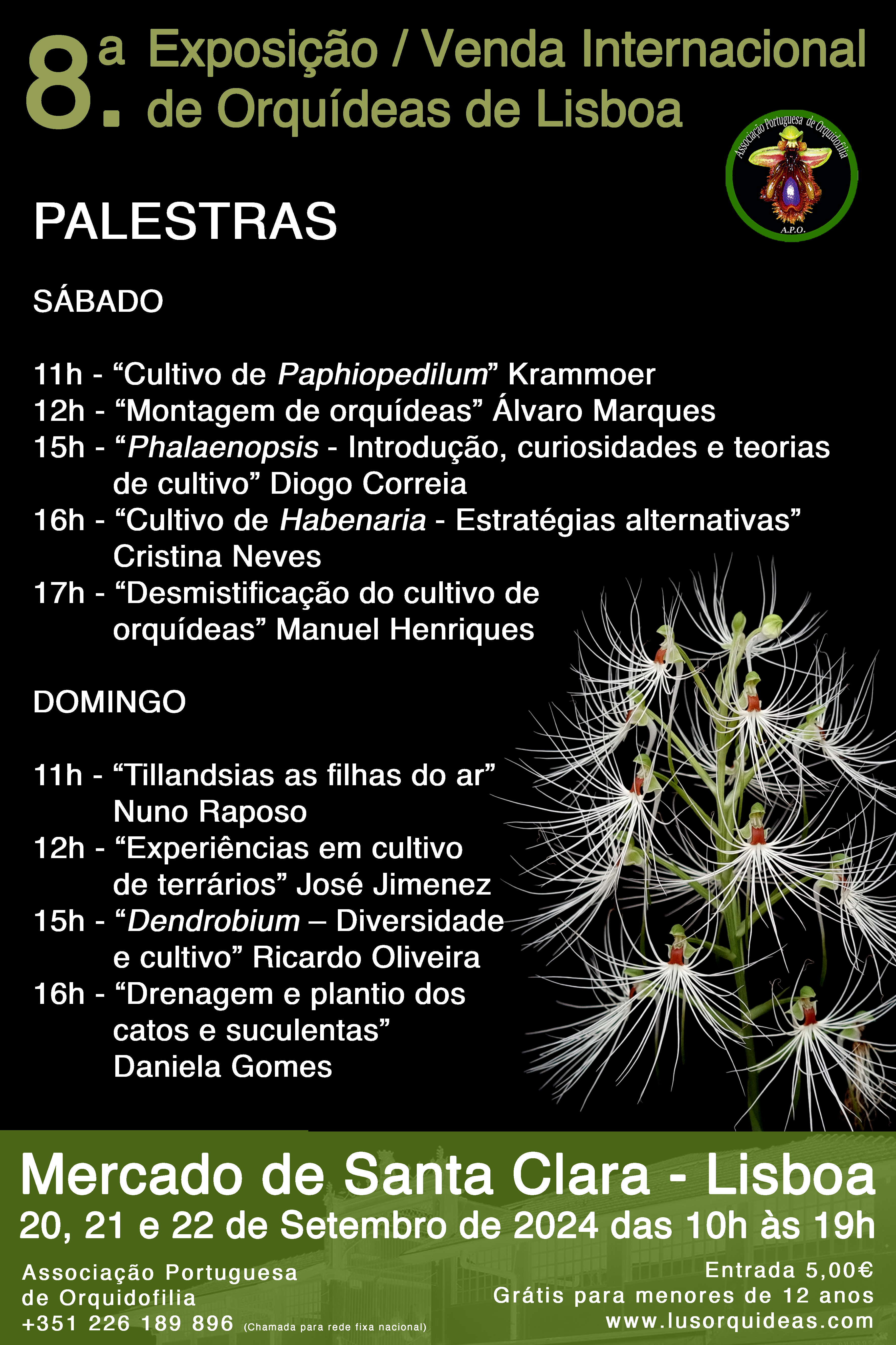 A 8.ª Exposição / Venda Internacional de Orquídeas de Lisboa poderá ser visitada nos dias 20, 21 e 22 de setembro de 2024, das 10H00 às 19H00, no Mercado de Santa Clara, em Lisboa. A entrada tem um custo de € 5,00 por pessoa, sendo gratuita para todas as crianças menores de 12 anos e para todos os associados da A.P.O. com as quotas em dia.