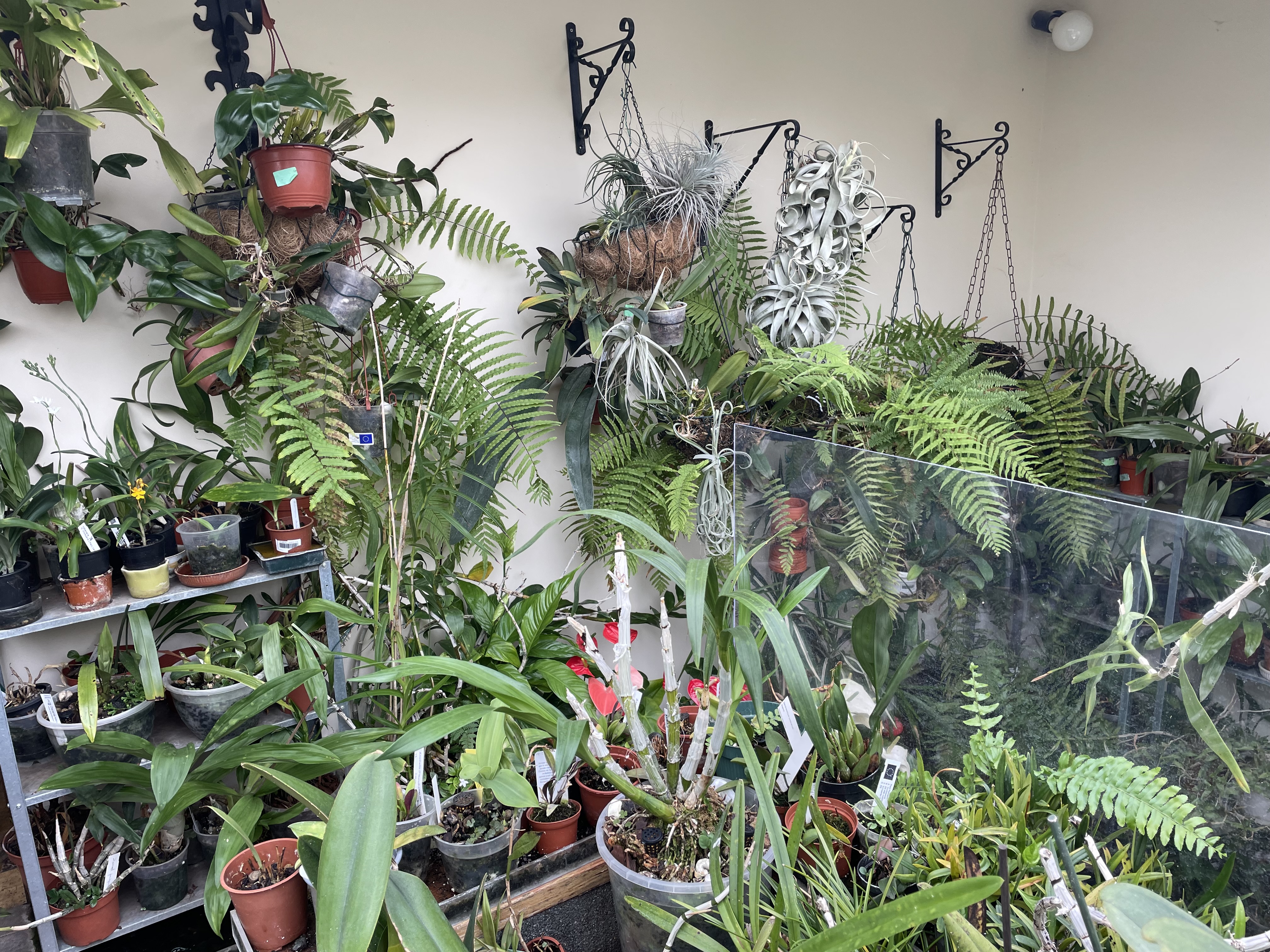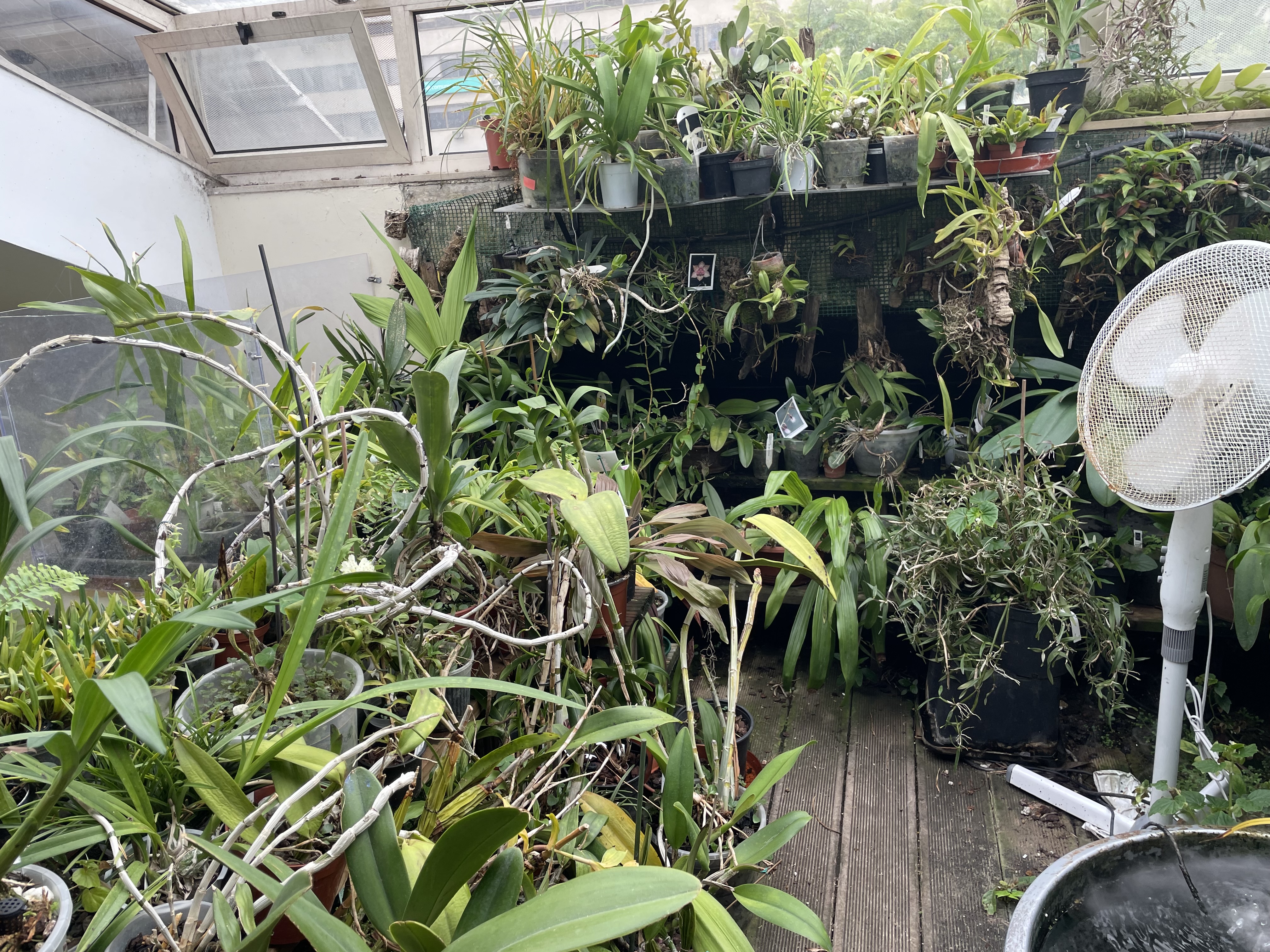 Cultivo Schomburgkia em Portugal desde há 15 anos. Como vivo no Porto perto do mar, as temperaturas que tenho poucas vezes passam dos 30º. Nas fotos abaixo pode-se ver o local onde a cultivo. É o aproveitamento do vão das escadas no último andar, onde tem uma claraboia de vidro espesso, com um lado virado a nascente, outro a sul e outro a poente. É um espaço aberto com janelas para o exterior e com uma tela de sombra e anti calor que é descida só nos meses de calor intenso para evitar queimaduras nas folhas das orquídeas. Desde outubro a fins de março, dependendo de ano para ano das temperaturas, deixo entrar todo o sol. As orquídeas que gostam de sombra ficam nas partes mais baixas não sendo atingidas pelos raios solares, mas as Schomburgkia estão nas prateleiras superiores a apanhar o maior número de horas de sol possível. Este género é um dos que necessita de mais luz, calor e sol para florir.