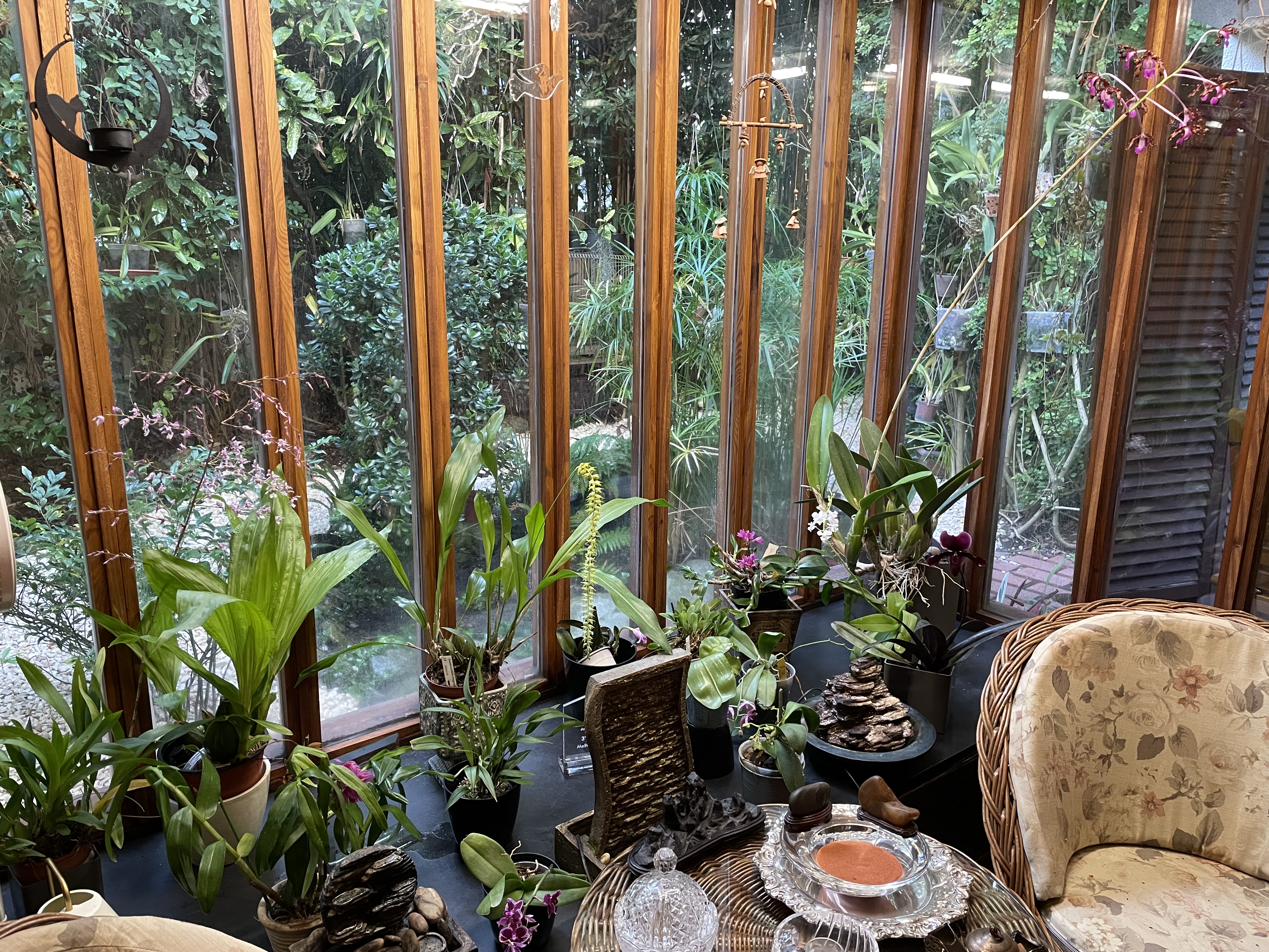 Tenho por costume trazer as orquídeas em flor para um cantinho que tenho no salão, foto 9, e depois de murcharem as flores ficam num local com menos calor as que são de estufa quente, para descansarem e se reabilitarem do desgaste que tiveram a florir. Quando começa a puxar novos pseudobulbos, quando a fase vegetativa começa a estar ativa, voltam para o seu local primitivo. É neste preciso momento que devemos mudar a orquídea de vaso ou simplesmente de substrato se isso for necessário. Não sendo necessário, pois o vaso ainda comporta o crescimento de mais pseudobulbos e o substrato não está desfeito, tipo terra, o ideal é não mexer na planta, pois evitamos danificar algumas raízes.