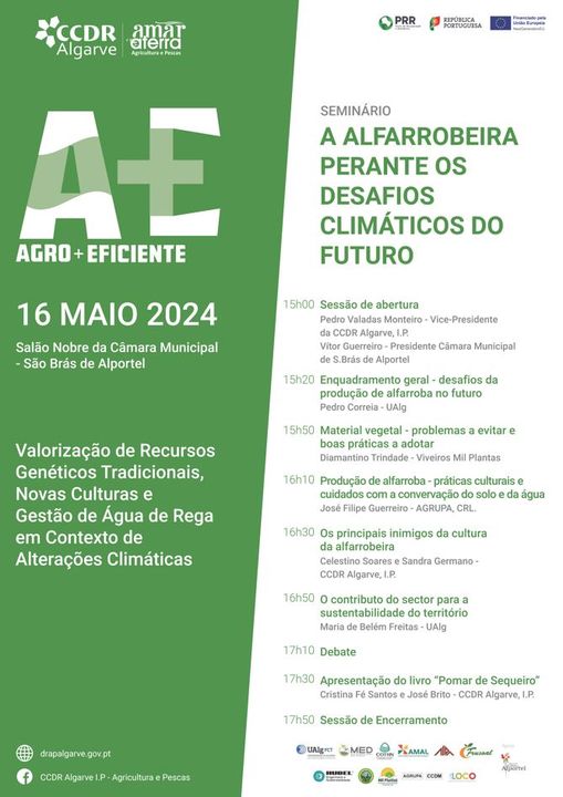 A valorização de recursos genéticos tradicionais, novas culturas e gestão de água de rega em contexto de alterações climáticas, enquadram o mote da iniciativa. Os desafios da produção de alfarroba, boas práticas a adotar, a conservação do solo e da água, os principais inimigos da cultura da alfarrobeira e o contributo do setor para a sustentabilidade do território são os principais painéis do Seminário, que reunirá um quadro de produtores, técnicos e especialistas da Universidade do Algarve, CCDR Algarve, AGRUPA (Agrupamento de Produtores de Alfarroba e Amêndoa, CRL) e Viveiro Mil Plantas.